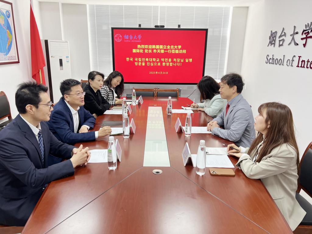 4月24日,韩国国立全北大学国际合作处处长朴天雄、国际处项目主管朴蓝天、崔艺花一行访问烟台大学国际教育交流学院。曲世金院长、中韩合作教育项目部老师与客人进行座谈交流。