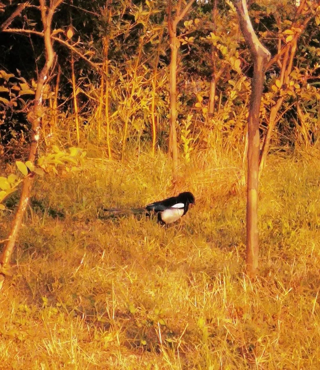 鸟儿驻足在落叶中觅食